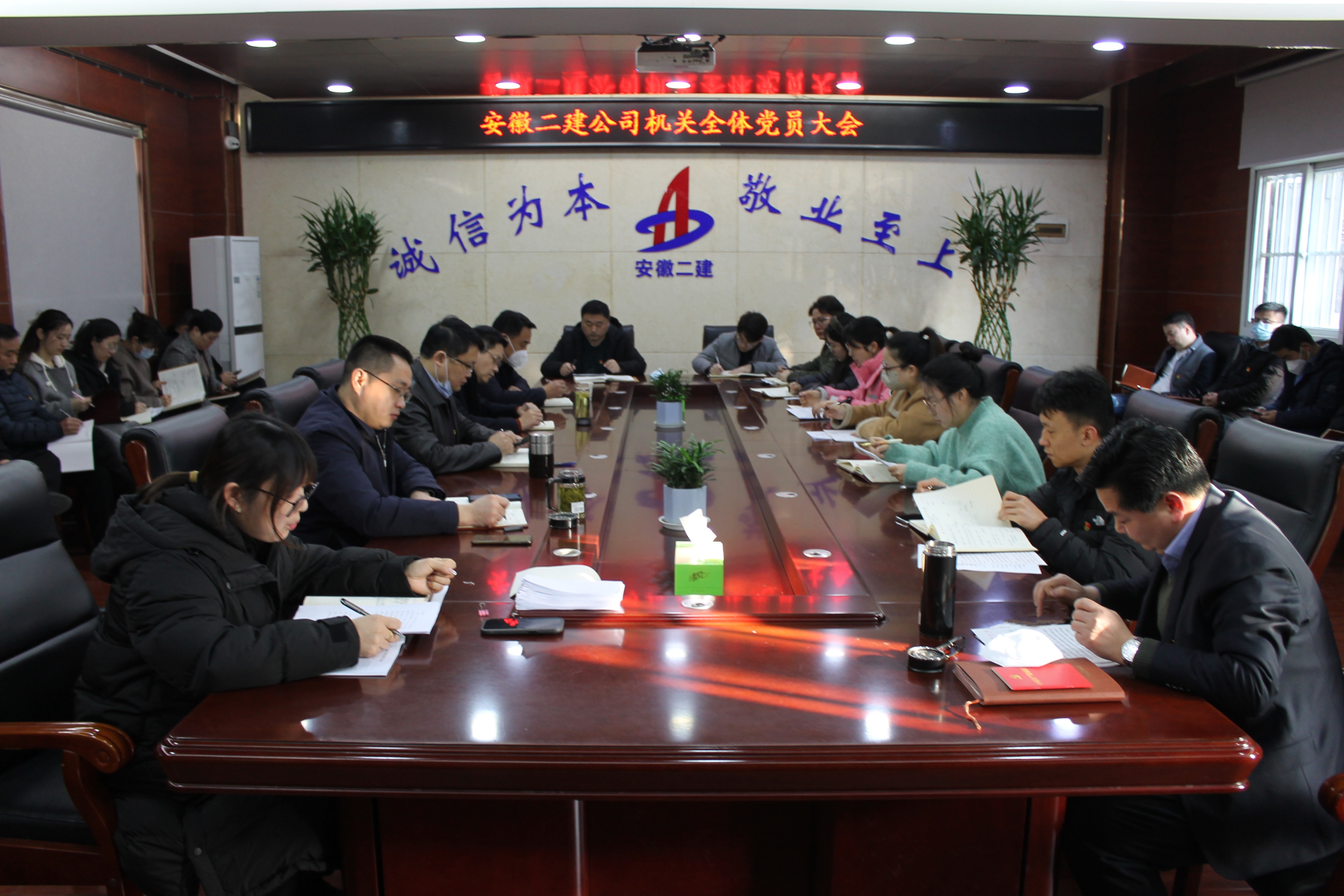 1月31日上午,安徽二建公司機關黨支部在公司一樓會議室召開黨員大會。公司黨委副書記、總經(jīng)理李建成出席會議并講話。會議由機關黨支部書記龍姍姍主持,43名黨員參會。