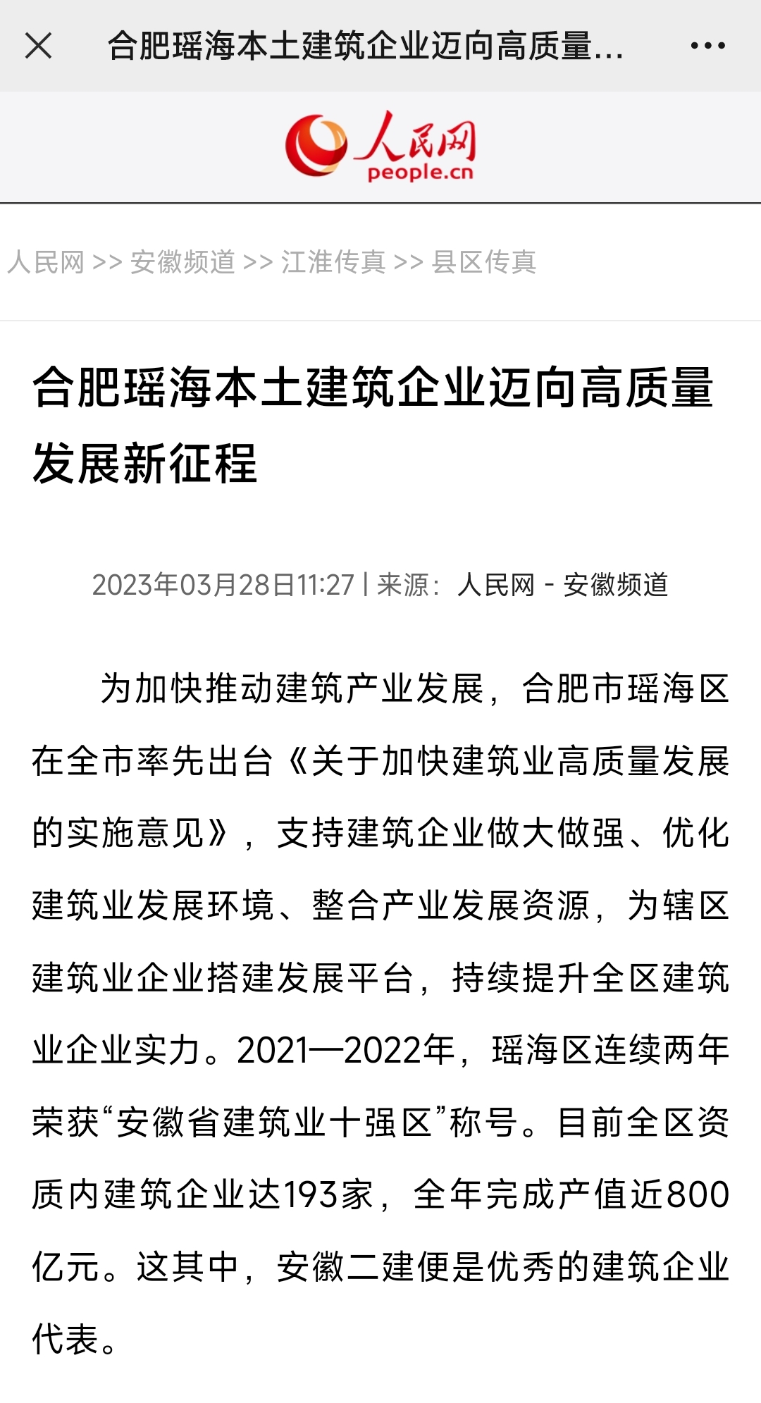 3月28日,人民網安徽頻道、中國網韻動安徽、中國日報網、安徽日報、大皖新聞、瑤海發布等權威主流媒體相繼報道安徽二建公司建企70周年發展成就,滿懷信心邁向高質量發展新征程。