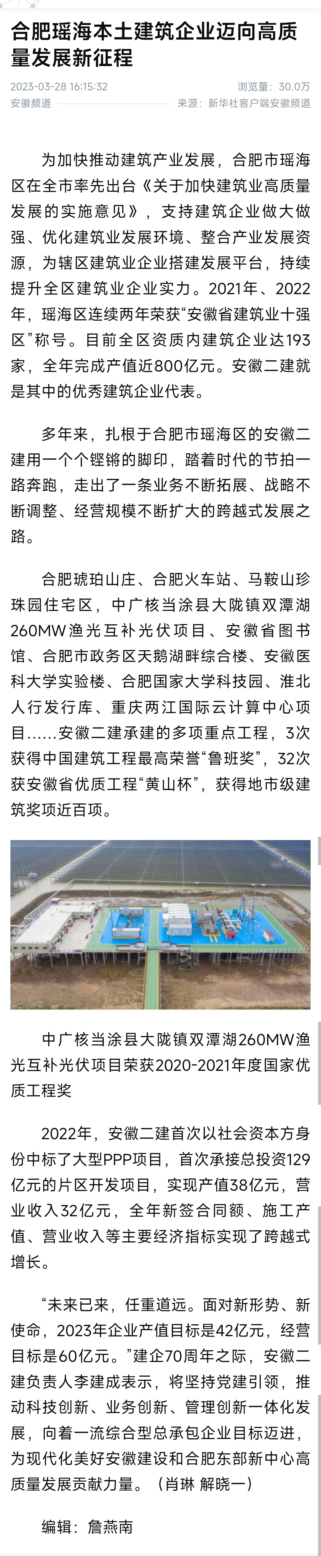 時光向前,二建向上!3月28日,自人民網(wǎng)、央廣網(wǎng)、中國網(wǎng)、中國日報網(wǎng)、安徽日報客戶端等主流媒體集中報道安徽二建七十年發(fā)展成就后,公司作為合肥瑤海本土優(yōu)秀建筑企業(yè)邁向高質(zhì)量發(fā)展新征程,首次刊登在新華社客戶端安徽頻道,一經(jīng)報道瀏覽量達(dá)30萬次。