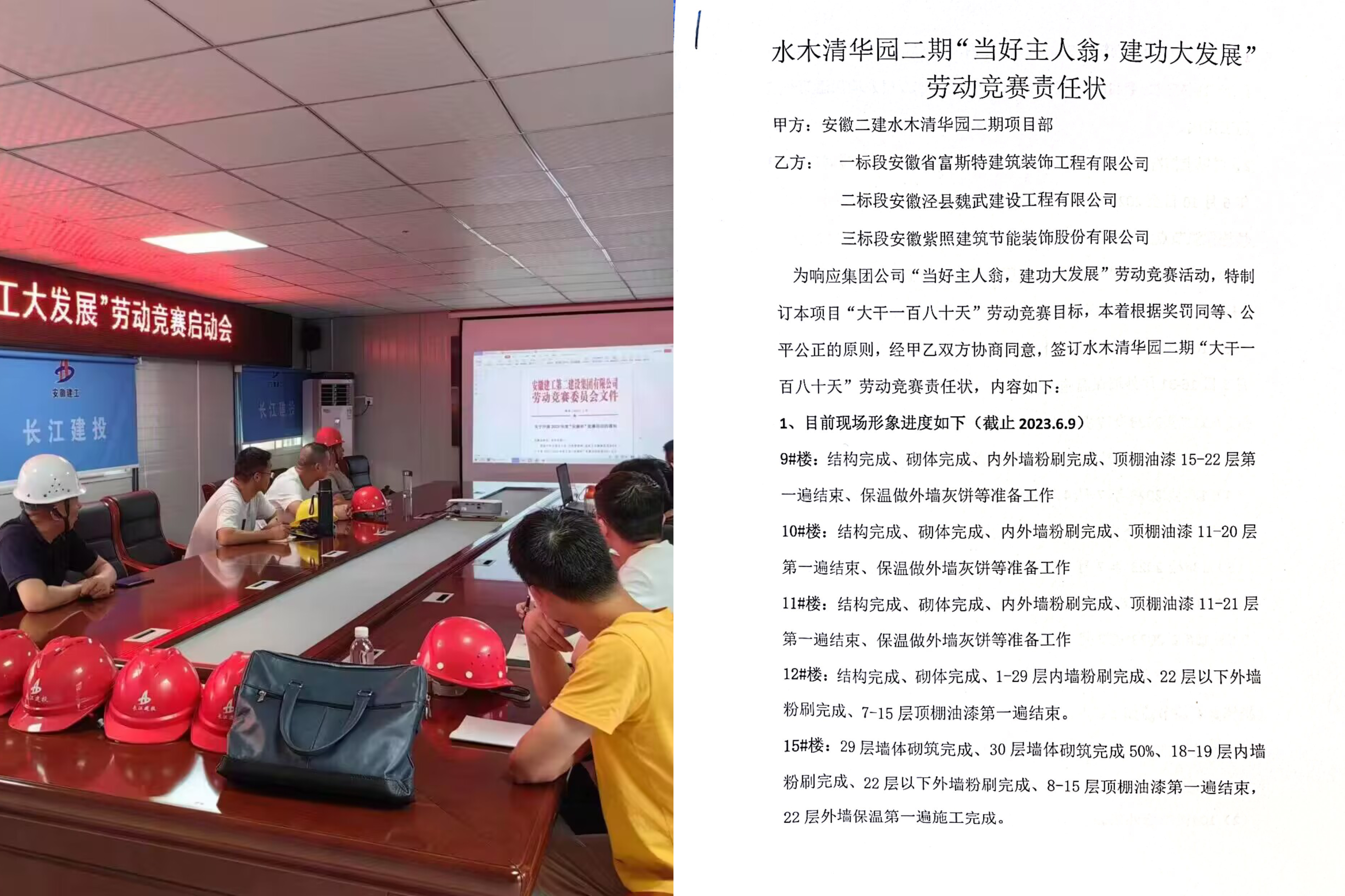 為積極響應公司“當好主人翁 建功大發展”勞動競賽號召,銅陵水木清華園二期項目部以“項目基礎管理年”活動為抓手,聚焦全年生產目標任務;以勞動精神為引領,下好先手棋,打好主動仗;以提質增效、價值創造為重點,不斷提升全員勞動生產率,形成比學趕超的濃厚氛圍,為完成勞動競賽目標任務奠定堅實基礎。