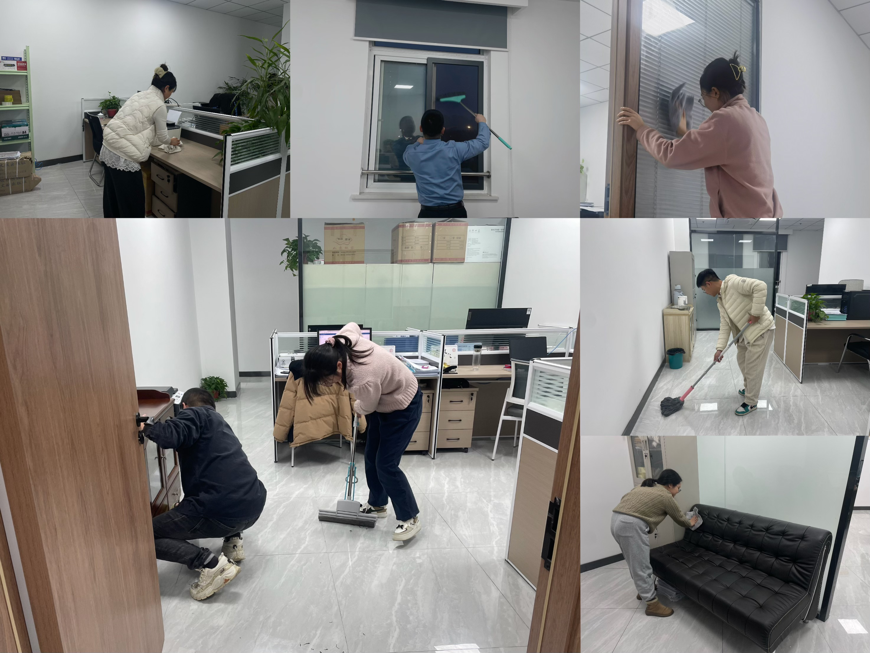 活動(dòng)中,大家分工明確,配合默契。有的擦拭辦公設(shè)備,有的清掃地面,有的分類(lèi)整理辦公用品、資料文件,還有的擦拭門(mén)窗,讓窗戶(hù)明亮通透,仿佛映照著新春的希望。經(jīng)過(guò)眾人共同努力,辦公區(qū)域煥然一新。