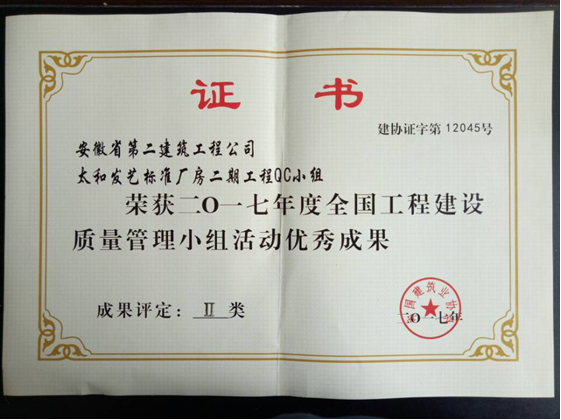 6月27—30日,安徽二建四分公司太和發(fā)藝標(biāo)準(zhǔn)廠房二期工程QC小組參加了由中國(guó)建筑業(yè)協(xié)會(huì)在四川成都主辦的全國(guó)工程建設(shè)優(yōu)秀質(zhì)量管理小組活動(dòng)成果交流會(huì)。經(jīng)過(guò)激烈的評(píng)比,太和發(fā)藝標(biāo)準(zhǔn)廠房二期工程QC小組《提高混凝土框架柱觀感質(zhì)量合格率》憑借著“高標(biāo)準(zhǔn)、嚴(yán)要求”的技術(shù)管控榮獲2017年度全國(guó)工程建設(shè)優(yōu)秀QC成果二等獎(jiǎng)。