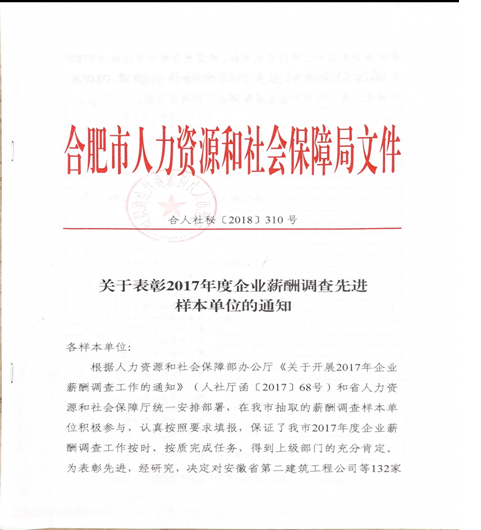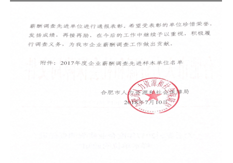 根據(jù)人力資源和社會(huì)保障部辦公廳《關(guān)于開(kāi)展2017年度企業(yè)薪酬調(diào)查先進(jìn)樣本單位的通知》(人社廳函【2017】68號(hào)),我公司領(lǐng)導(dǎo)高度重視,按照通知要求精心組織安排人員,以快速高效嚴(yán)謹(jǐn)?shù)墓ぷ鲬B(tài)度,圓滿(mǎn)完成了此次企業(yè)薪酬調(diào)查工作,得到了上級(jí)部門(mén)的充分肯定,榮獲了“2017年度企業(yè)薪酬調(diào)查先進(jìn)樣本單位”殊榮。