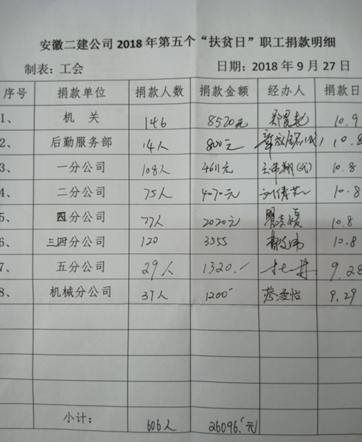 開展全國扶貧日捐款活動距今已是第五個年頭,它體現了黨中央、國務院對扶貧開發工作的高度重視和對貧困地區群眾的關愛。工會每年牽頭組織此項活動,公司領導率先垂范、帶頭捐款,廣大職工積極響應,機關、分公司、項目部、一線班組員工紛紛奉獻自己的一份愛心。短短幾日,全公司上下共有606名職工參與,累計捐款26096元。