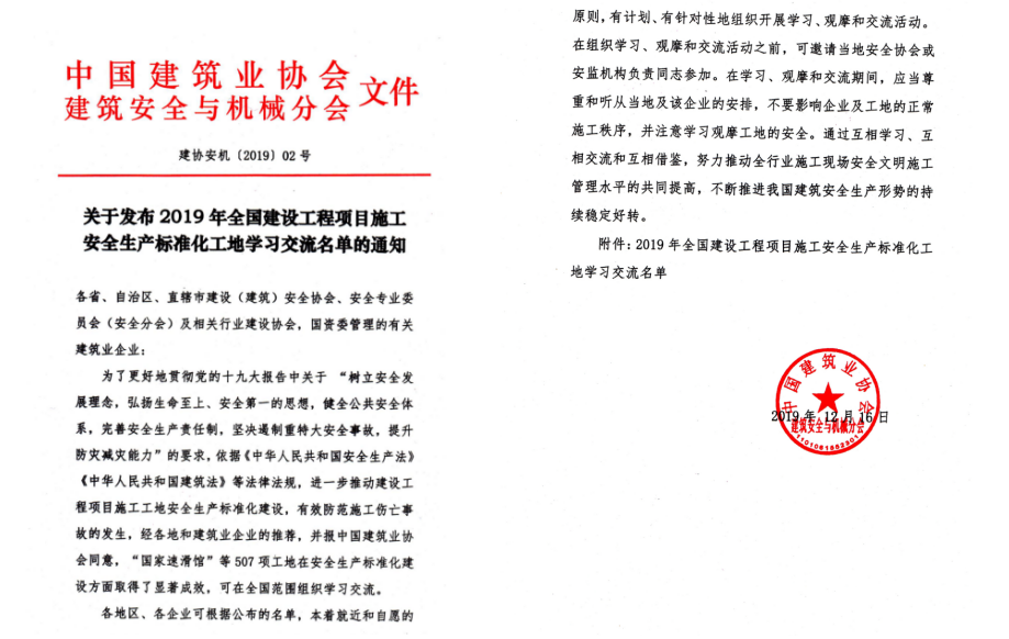 2020年1月16日,中國建筑業協會建筑安全與機械分會傳來喜訊,安徽二建承建的廣元大學城•紅街項目榮獲2019年度全國“建設工程項目施工安全生產標準化工地”榮譽稱號。