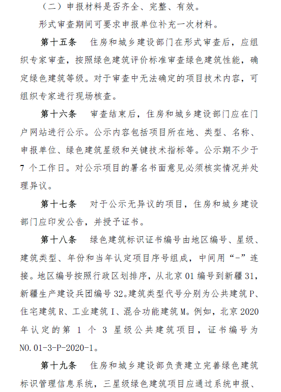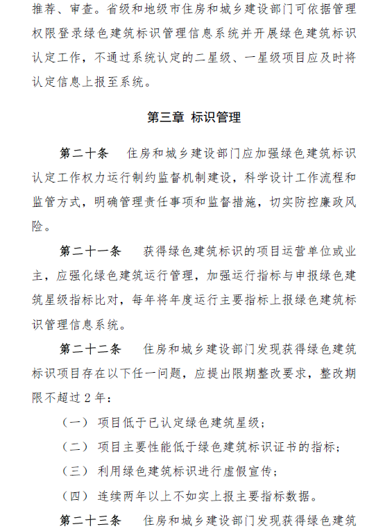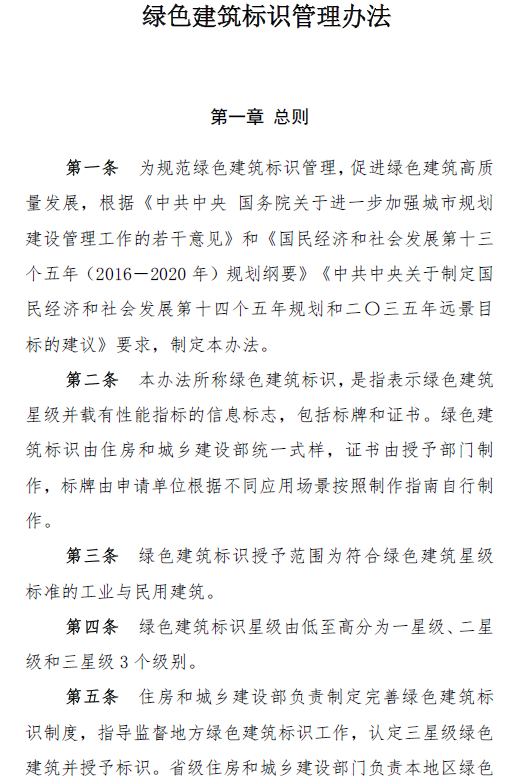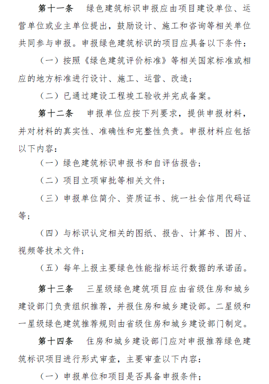 《辦法》規(guī)定,住房和城鄉(xiāng)建設部負責制定完善綠色建筑標識制度,指導監(jiān)督地方綠色建筑標識工作,認定三星級綠色建筑并授予標識。省級住房和城鄉(xiāng)建設部門負責本地區(qū)綠色建筑標識工作,認定二星級綠色建筑并授予標識,組織地市級住房和城鄉(xiāng)建設部門開展本地區(qū)一星級綠色建筑認定和標識授予工作。