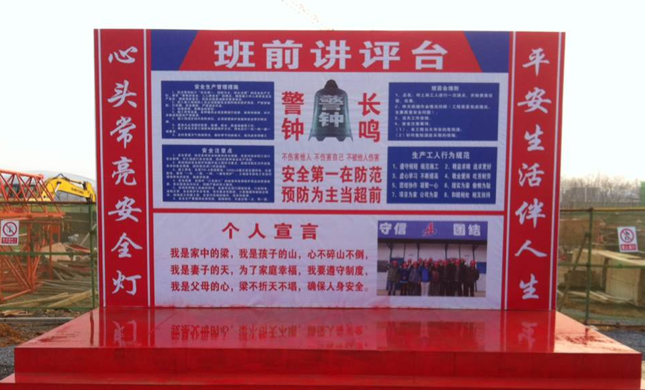 在項目施工現(xiàn)場,坐落著一塊長5米、寬2米的宣傳板,上方寫著“班前講評臺”,左右各寫“心頭常亮安全燈”“平安生活伴人生”的字樣。這是三分公司宿松安建龍溪山莊項目部工地開展的施工前安全教育活動。