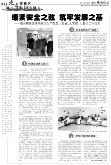 年后復工不久,亳州市高新區即對轄區內的施工單位進行逐個復工復產以及安全生產隱患大檢查、大管控、大整治。3月3日上午,亳州市高新區建管主任、第五管理中心主任、環保中心主任等領導以及亳州市記者來到亳州濱江壹號項目進行實地現場檢查,并采訪了項目經理朱曉亮。在聽取項目匯報、查閱安全管控資料后,當地各主管部門領導充分肯定了項目在現場安全、環保管控等方面的有力舉措,并在亳州晚報上刊登了項目全方位的安全管理體系。
