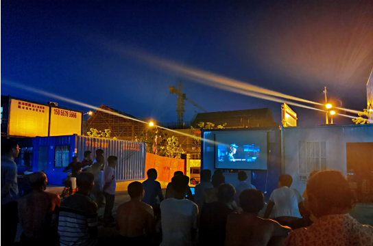 夜幕降臨,放映場上辛勤勞作一天的工人們聚在一起,平時忙碌的工作,以及住宿條件的限制,每天的“兩點一線”讓他們的業(yè)余生活枯燥而單調(diào)沒有那么豐富,通過在工人生活區(qū)放映電影,讓他們的業(yè)余生活多了一項文化娛樂項目,可以給他們帶來一場文化盛宴。