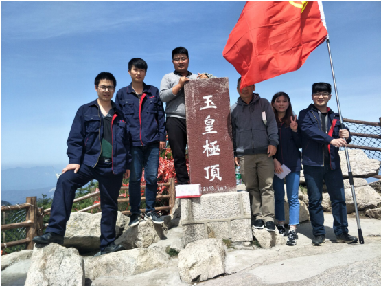 登山小隊在團旗的引領(lǐng)下,從堯山腳下向玉皇山頂進發(fā)。登山途中,大家一邊欣賞美麗的風(fēng)景,盡情享受新鮮的空氣和明媚的陽光,一邊聊天,暢談著戶外活動的愉悅感受。經(jīng)過近兩個小時的奮進,在不斷的互相勉勵、加油鼓勁下,登上了峰頂,并合影留住這美好的瞬間。