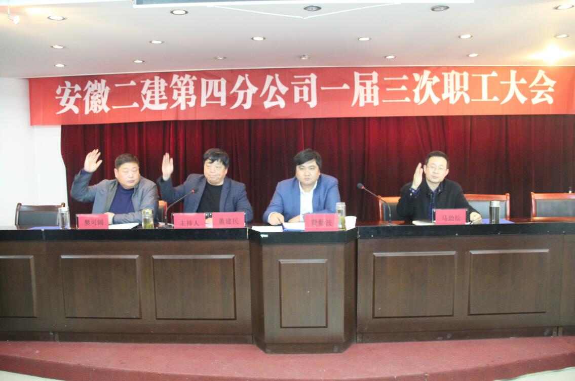 3月22日上午,安徽二建第四分公司順利召開了一屆三次職工大會,公司黨委副書記、紀委書記仇多維,總經理助理、工會副主席蒯家江,黨委工作部主任施用宏到會指導,分公司52名職工參會,支部書記董建民主持大會。