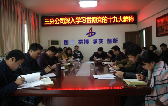 學(xué)習(xí)中,與會(huì)黨員認(rèn)真研讀了報(bào)告,并就黨的十九大主題、中國(guó)共產(chǎn)黨歷史使命、習(xí)近平新時(shí)代中國(guó)特色社會(huì)主義思想、堅(jiān)定不移全面從嚴(yán)治黨,以及貫徹新發(fā)展理念、建設(shè)現(xiàn)代化經(jīng)濟(jì)體系等章節(jié)和內(nèi)容進(jìn)行了重點(diǎn)學(xué)習(xí)領(lǐng)會(huì)。與此同時(shí),三分公司黨支部書記陳習(xí)武對(duì)如何進(jìn)一步學(xué)習(xí)貫徹黨的十九大精神提出了三點(diǎn)要求,他強(qiáng)調(diào):一是要把學(xué)習(xí)好貫徹好十九大精神作為當(dāng)前和今后一段時(shí)期的首要政治任務(wù),認(rèn)真學(xué)習(xí)領(lǐng)會(huì)核心要義和精神內(nèi)涵,始終在思想上、政治上、行動(dòng)上與習(xí)近平總書記為核心的黨中央保持高度一致;二是創(chuàng)新學(xué)習(xí)方式方法,堅(jiān)持學(xué)以致用。要通過報(bào)紙、電視和網(wǎng)絡(luò)等多種平臺(tái),通過集中學(xué)習(xí)、自學(xué)等方式,全面、準(zhǔn)確、深入地學(xué)習(xí)領(lǐng)會(huì)大會(huì)提出的一系列新思想、新提法、新觀點(diǎn)、新舉措,并要堅(jiān)持以學(xué)促做,切實(shí)用十九大精神指導(dǎo)實(shí)踐、推動(dòng)工作;三是每位黨員都要制定學(xué)習(xí)貫徹黨的十九大精神計(jì)劃,明確學(xué)習(xí)時(shí)間節(jié)點(diǎn),嚴(yán)格落實(shí),黨支部將把學(xué)習(xí)貫徹黨的十九大精神作為民主評(píng)議黨員的一項(xiàng)重要內(nèi)容。