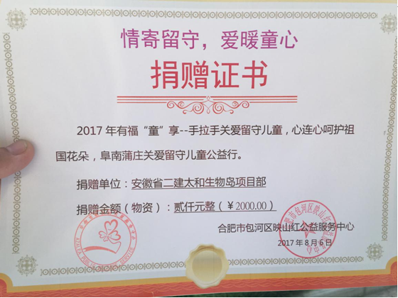 8月6日,由安徽省委政研室、安徽省精神衛(wèi)生防治中心、合肥市映山紅公益服務(wù)中心主辦的“情寄留守,愛(ài)暖童心,有福童享”獻(xiàn)愛(ài)心公益活動(dòng)在阜南縣段郢鄉(xiāng)蒲莊村張克樓小學(xué)舉行。安徽二建太和生物島一期項(xiàng)目部項(xiàng)目經(jīng)理任兵代表項(xiàng)目部參加了本次活動(dòng)。
