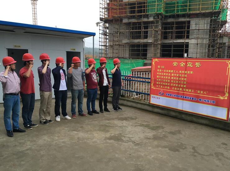 早上六點,清晨第一縷陽光剛剛灑下,項目部管理人員已在安全宣誓牌前排列整齊,面對莊嚴的宣誓牌,全體成員在項目技術負責人王歡的帶領下,右手握拳置于面龐,鄭重地齊聲宣讀誓詞:我是一名安徽建工人,我鄭重宣誓:時刻注意安全,遵守安全法規;履行安全職責,提高安全技能;杜絕三違現象,保證四不傷害;強化紅線意識,促進安全發展;為了家人幸福,企業發展,誓做建工“安全人”。隨后,項目部全體成員在項目經理費祥琪的帶領下,陸續在宣誓牌上簽下了自己的名字,表明自己時刻謹記安全宣誓內容,堅持安全生產的決心。