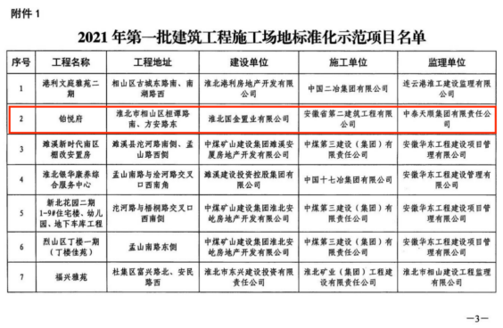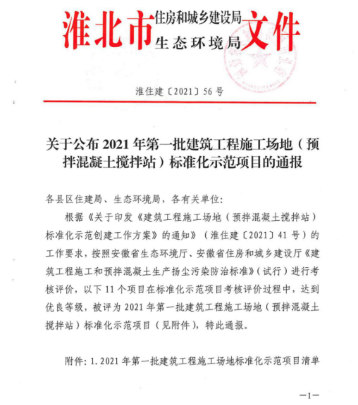 11月2日,淮北市住房和城鄉建設局、淮北市生態環境局公布了第一批淮北市“建筑工程施工場地標準化示范項目”名單,安徽二建第一分公司淮北鉑悅府項目在考核評價過程中,達到優良等級,被評為2021年淮北市第一批建筑工程施工場地標準化示范項目。